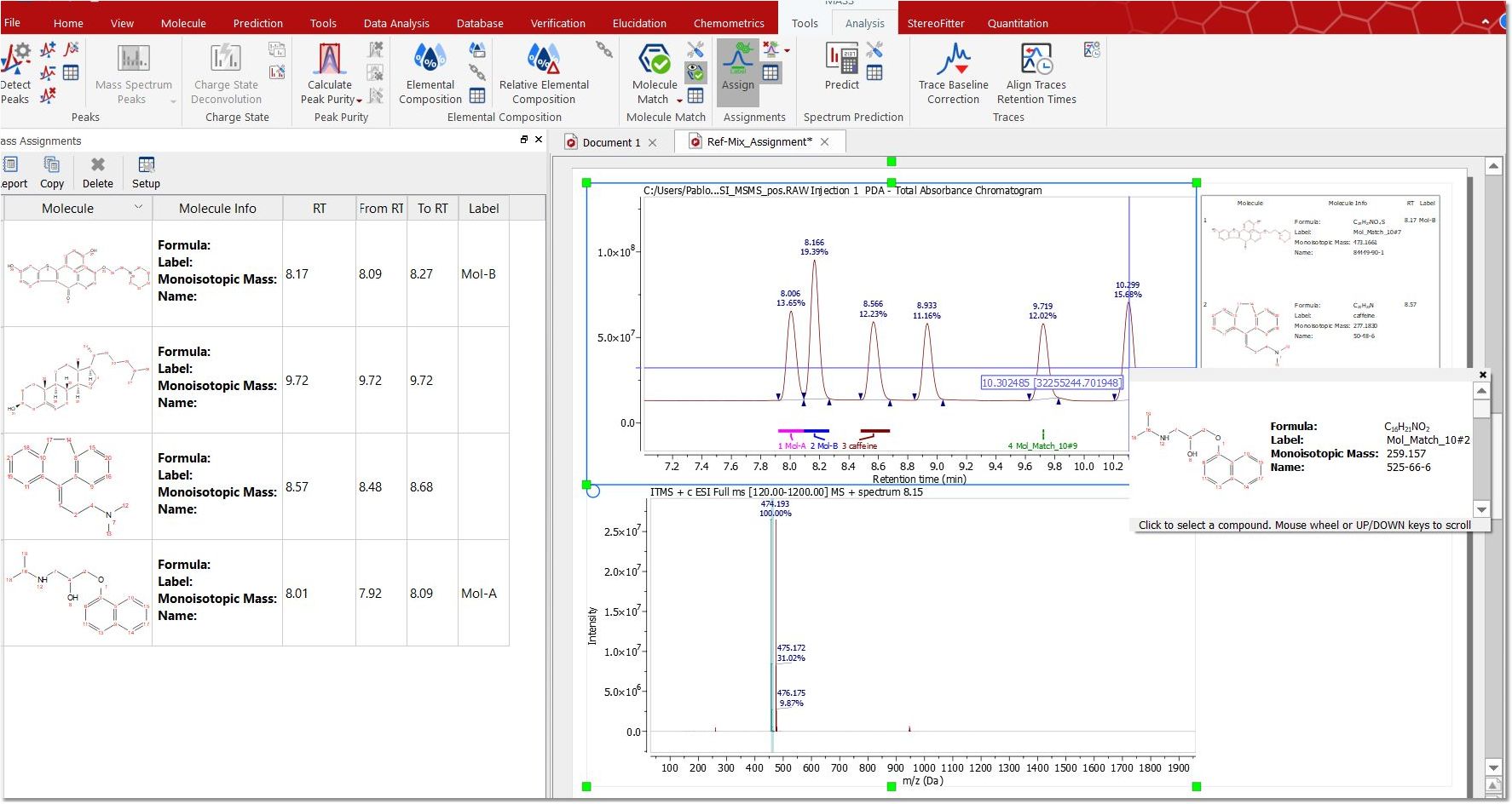 Clicking on the 'Assign' button will allow you to load your molecular structures (if you do not have any). Next, click (or click and drag to select a range) on the chromatogram peak that you want to assign. If you have several molecules loaded, you will be allowed to select the desired structure by using your mouse wheel (or the up/down arrow keys).