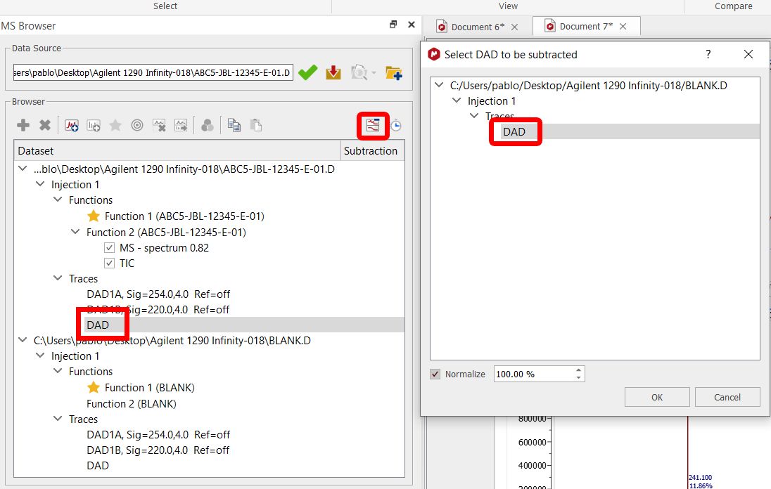 In the case that you are working with UV chromatograms, the workflow will be the same. In this case, you will need to select the DAD (or PDA) as the main function and subtract the applicable blank: