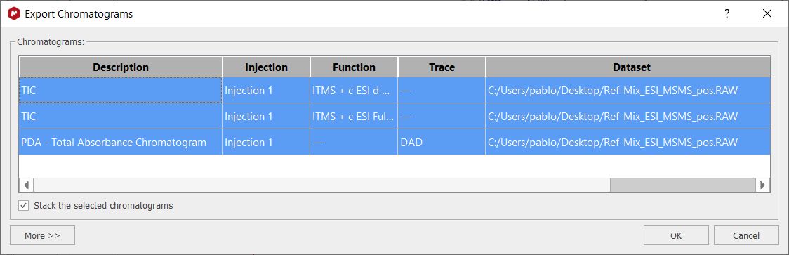 An additional option "Stack the selected chromatograms" allows to export and stack the selected chromatograms at once. If it's not checked, each chromatogram gets exported to a new page.