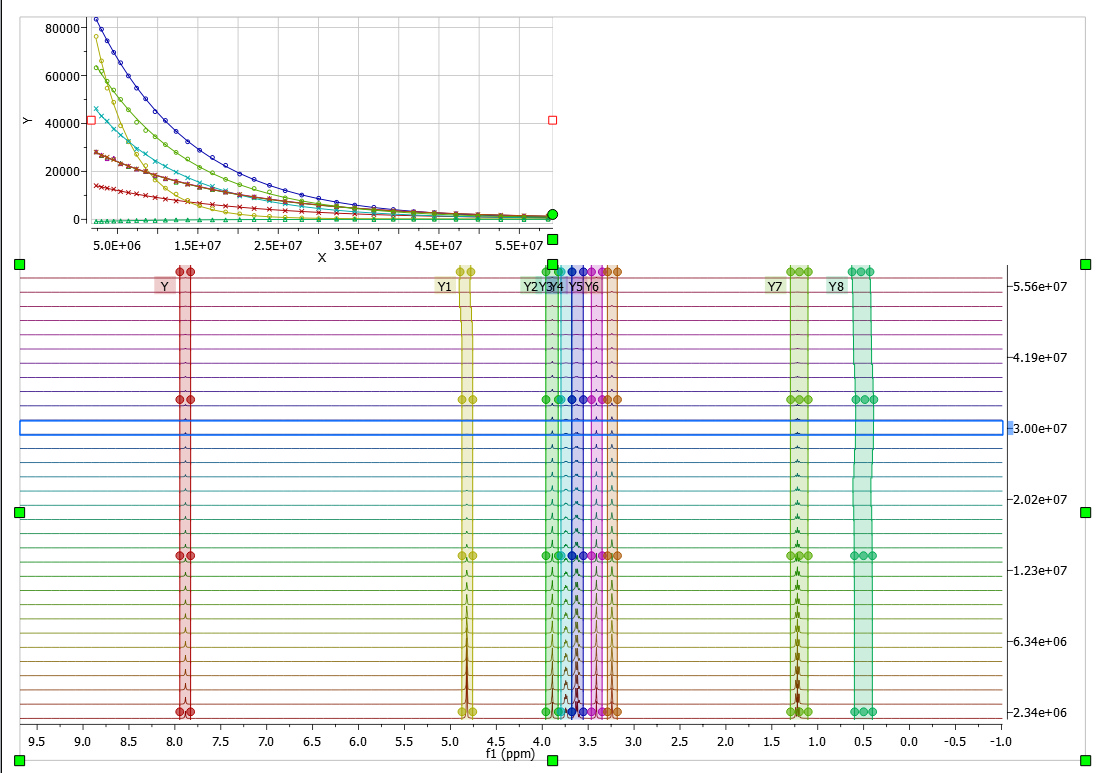 Mnova incorporates a 'Data Analysis' feature for the analysis of diffusion experiments. This feature covers also relaxation (T1/T2) experiments, kinetics, reactions monitoring, etc.