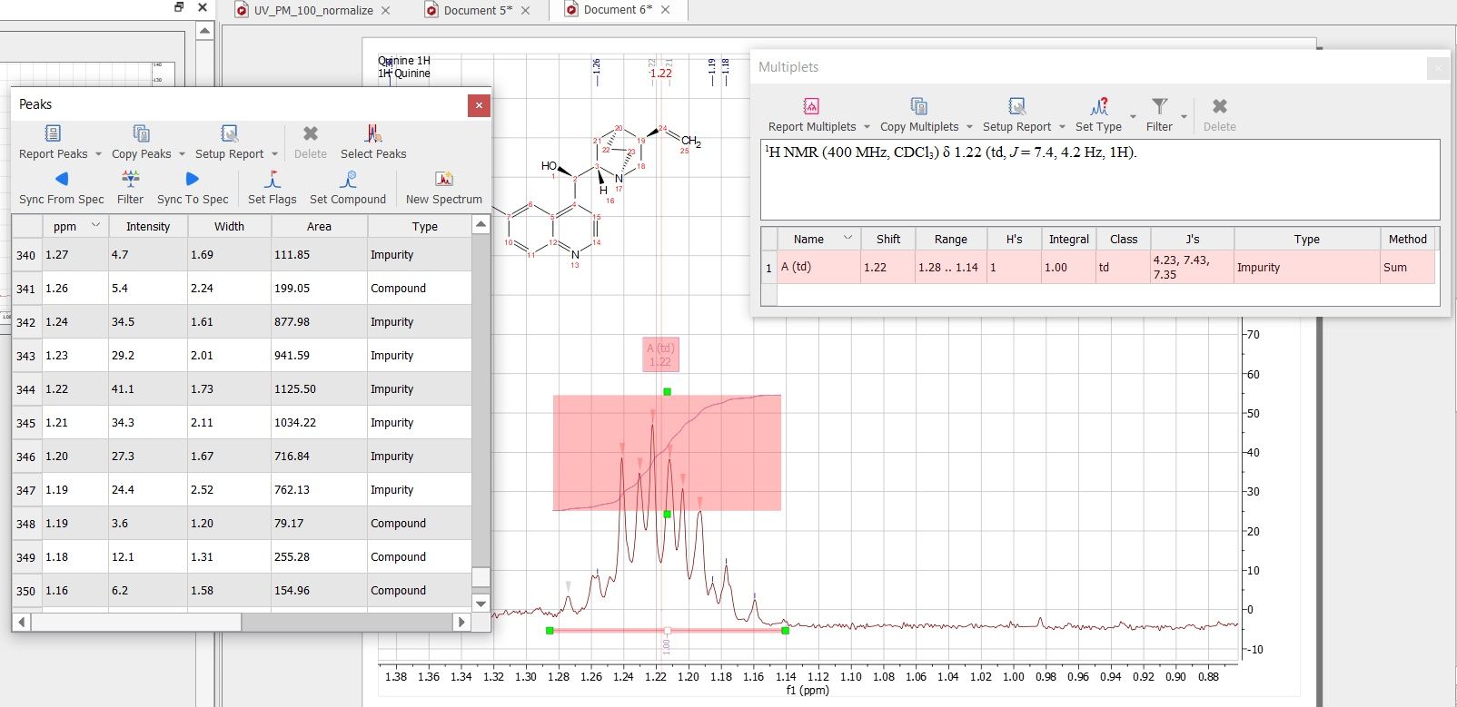 When changing the multiplet type, all the peaks belonging to the multiplet will be changed to that type. In the example below, we changed the multiplet peak to compound and all the peak types were updated: