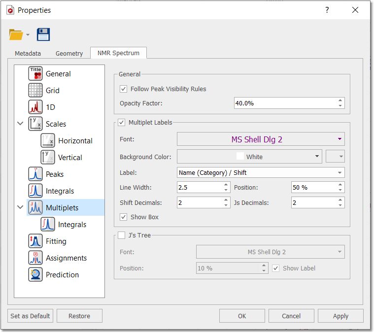 You can also select the color, line width, decimals for the shifts and coupling constants, the font and the margin of the 'Multiplet' boxes: