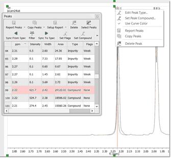Peak curves are now active objects which can be interacted with, and three-way highlighting of peaks table, peak labels and the peak themselves has been implemented. For example, double clicking on any peak label will display the 'Peaks Table', hovering the mouse over the peak label (or on any table) will highlight the peak in the spectrum and allow the user to interact directly with that peak. Clicking on any peak of the spectrum will automatically scroll up/down the table to the position of currently highlighted peak in the spectrum. Right clicking on any peak, will allow you to change the 'Peak Type' from the 'Peaks context' menu (and to set peak compound, use curve color, report, copy and delete peaks).