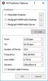Following the menu Prediction/Prediction Nuclei Options will display a dialog box from where you will be able to select the chemical shift limits of the spectral window, as well as other parameters, such as number of points, frequency, Line Width, solvent and minimum coupling constant value. If you are going to predict a 1H-NMR spectrum, you can also exclude the 'Labile Protons' from this window