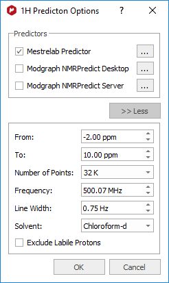 From/To: Lower and upper limits for the chemical shift scale Number of Points: Number of points used to build the predicted spectrum. Actually, Mnova predicts a time domain signal (FID) which is automatically Fourier Transformed to yield the final predicted frequency domain spectrum. Line Width: Line width at half height of all peaks in the predicted spectrum. Solvent: Prediction solvent. |