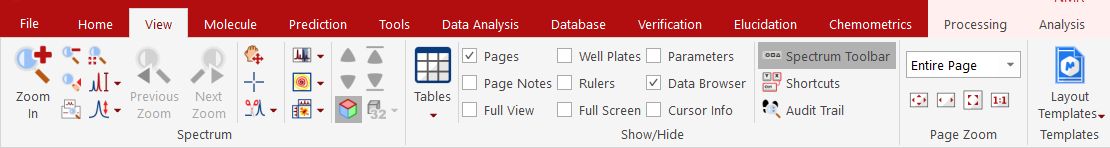 This ribbon contains zoom in modes, crosshair, 3D NMR viewer, tables and layout templates features.