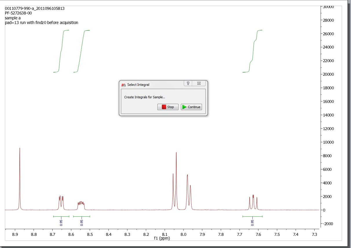 现在,我们将整合分析物的 3 个多重信号(选择附近的芳香族)。整合完成后,再次点击 "继续 "按钮。